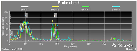 7 t# _1 s q1 D( n3 E0 C$ ]# E 探头检测 点击“Data Collection—Probe Check”,开始测深探头。点击“Data Collection—Stop datacollection”或者 ,停止测试。该功能可以保证测量质量,优化数据采集,也可以用来诊断仪器工作是否正常。如图所示,A 指发生声波强度,B 指从采样点反射回来的声波强度,C 指从边壁反射回来的信号强度。其中 Amplitude 每个数值对应信号强度为 0.45dB。因为采样点距离探头中心 5cm,所以正常情况应该如图所示,在 50mm 处有信号波峰。$ |5 i2 |' P$ H* g/ u