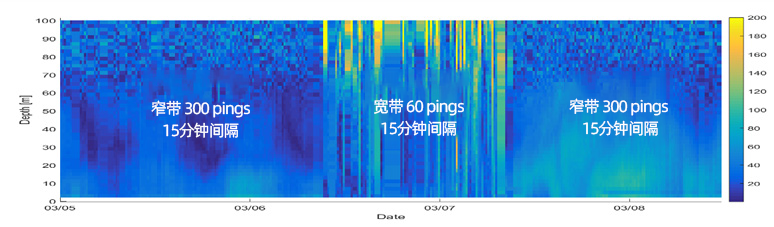 4 P- h* I4 n$ W3 a, }3 ~ 图1:宽带不适合在摇摆浮平台上测量海流,如图中结果来自传感器俯视的实时报告。该传感器支持双向通信,因此可以在窄带和宽带之间远程切换。请注意:激活宽带模式后的数据变得更加嘈杂,传感器的测量范围约为 70 米。 7 |2 b/ k& u+ C