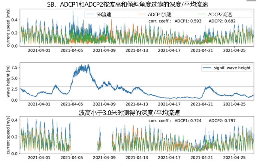2 L5 g0 e5 t0 U8 r' c# z+ L; N 在漂浮于水面的平台上使用声学多普勒海流计具有极大的技术挑战。因为每次测量都需要对姿态和朝向的不断变化进行瞬时补偿,金属组件产生的磁干扰以及与水下物体(如系泊索链)产生的声波散射还可能会带来流速和流向误差。此外,浮标在波浪中“晃动”,若采用宽带模式的声学传感器,数据就会变得更加嘈杂,如图 1。