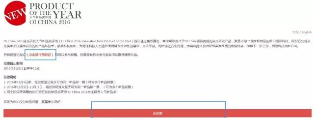 1.点击评选链接,戳下方阅读原文直达投票链接。2.曾经登记参观过OI China的直接点击“去投票”,第一次投票的请先点击“进行预登记”再进行投票。