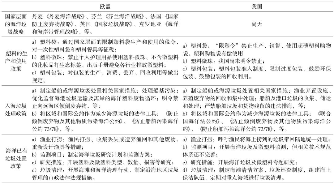表1 我国海洋塑料垃圾政策措施与欧盟的对比