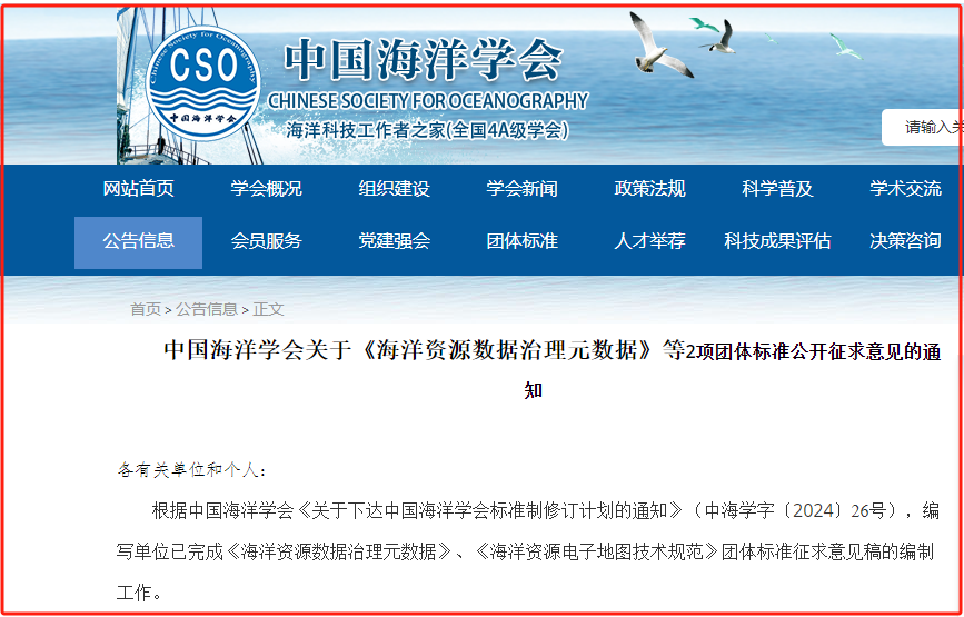 中国海洋学会关于《海洋资源数据治理元数据》等2项团体标准公开征求意见的通知