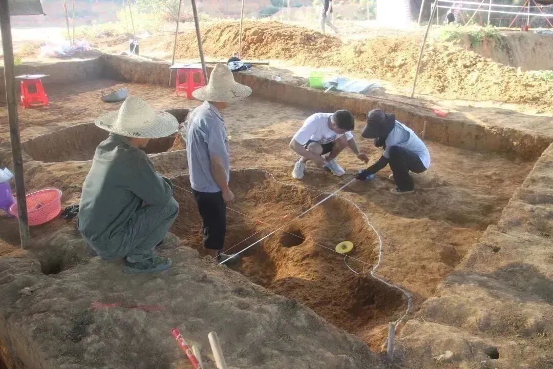 2022年5月至7月,为配合南平市武夷新区生态食品产业园建设,福建省考古研究院对该遗址进行了抢救性考古发掘,发现窑址、灰坑等遗迹。遗址出土遗物以陶器占绝大多数,陶器以泥质或夹砂印纹硬陶为主,可辨器型有尊、罐、釜、豆、钵、盆、甗形器等。陶器纹饰见有席纹、方格纹、篮纹、绳纹、云雷纹、弦纹、圆点纹、刻划斜线纹等,个别器物上存在刻划符号现象。另出土有石锛、石网坠等少量石器及木骨泥墙残块。 & d5 H( K1 M. b. L: B7 B