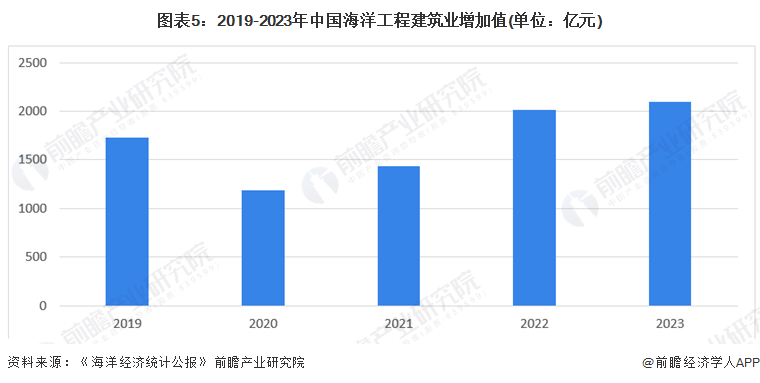 ) j& c+ t& ?, }% h: | 海洋工程建筑业指用于海洋开发、利用、保护等用途的工程建筑施工及其准备活动。根据数据显示,2023年我国海洋工程建筑业增加值为2098亿元,同比增长4.12%,2019至2023年CAGR为4.91%。目前多个沿海城市已将大型海上旅游综合体建设纳入发展规划,与养殖、海洋能发电、海底观光等功能的进一步融合成为行业新趋势,未来多元化需求的海工建筑将带动海工装备市场规模的增加。 & C; U+ [) n9 m( g2 ]