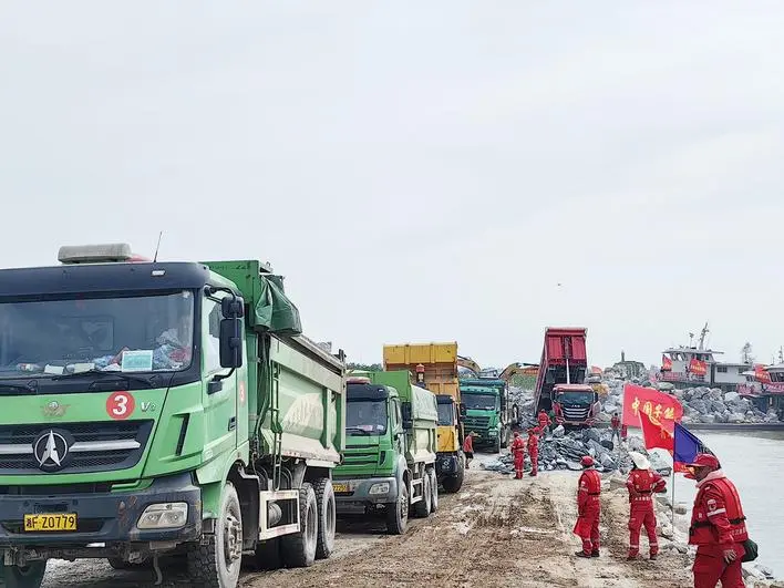 # C i) m, v Y/ E) i0 C& l0 W4 G 堤上,满载块石、砂卵石等物料的卡车,一趟趟向水中卸料,尘土飞扬。水上,大型驳船轰鸣而来,将石料一轮轮抛投下,浪花四溅。同时,无人机在傍晚监测过决口口门宽度、水流流速后,夜幕降临仍随时待命,快艇则在水面监测流量。