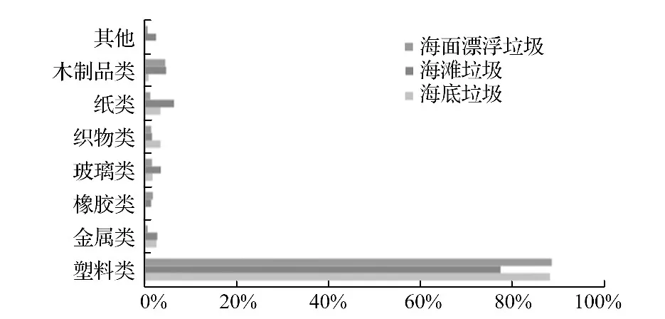 图1 2018年监测区域海洋垃圾主要类型及占比 ; W# Q0 f5 L& e1 J( t) i) ^2 N! X