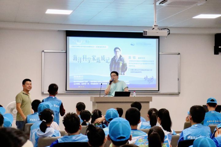 参观结束后,来自海洋二所的副研究员张海峰和龙钰为孩子们呈上了精彩绝伦的科学分享盛宴。张海峰博士长期从事南极考察与研究工作,先后参加我国南北极考察、大洋调查等十余次,他满怀激情地向孩子们讲述着二所那些科考船的传奇故事。