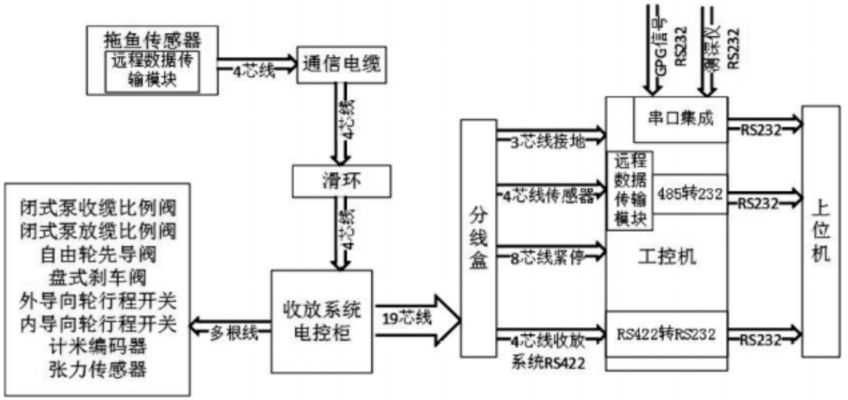 自动控制系统完成整个走航式剖面测量系统的通讯与控制,主要包括收放系统电控柜、工控机、上位机。收放系统电控柜与工控机通过一根多芯电缆经分线盒进行通讯,包括收放系统的控制、拖体传感器的数据信号通讯、紧停控制、接地。控制方案如图2所示。 % G( ?$ V9 ~7 {$ I# b |# r. p' [2 @