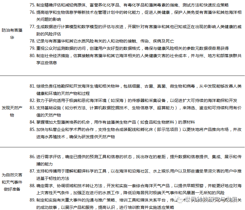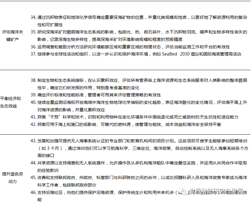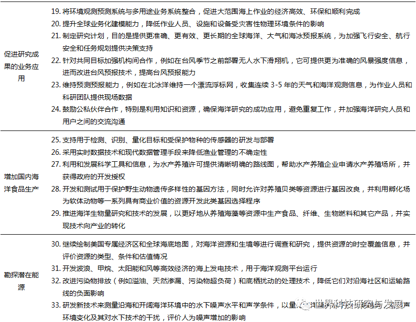 在美国,海洋及其丰富的自然资源对于创造就业机会、促进海洋产业、提升美国人的整体福祉发挥了关键作用,其沿海港口和全球水道构成了世界贸易的中心,通过海运企业促进了美国经济的繁荣。优化美国专属经济区和公海的可持续利用对于美国的全球经济领导地位是至关重要的,海洋是大量生物和非生物资源的家园,其中大部分海洋未被开发,为经济增长提供了巨大的潜力。海洋科学技术发展可以更快更好地掌握美国海洋生物资源和非生物资源的勘探、评估和可持续管理情况,使资源管理者和决策者能够负责任地利用美国的海洋资源。促进经济繁荣是最新“十年”计划中新增的海洋科技发展目标之一,涉及增加国内海洋食品生产、勘探潜在能源、评估海洋关键矿产、平衡经济和生态效益、提升蓝色劳动力等五个方面,共提出了23个科学研究优先事项,详见表3。 " g2 t' ], E, h. U8 y6 L0 S