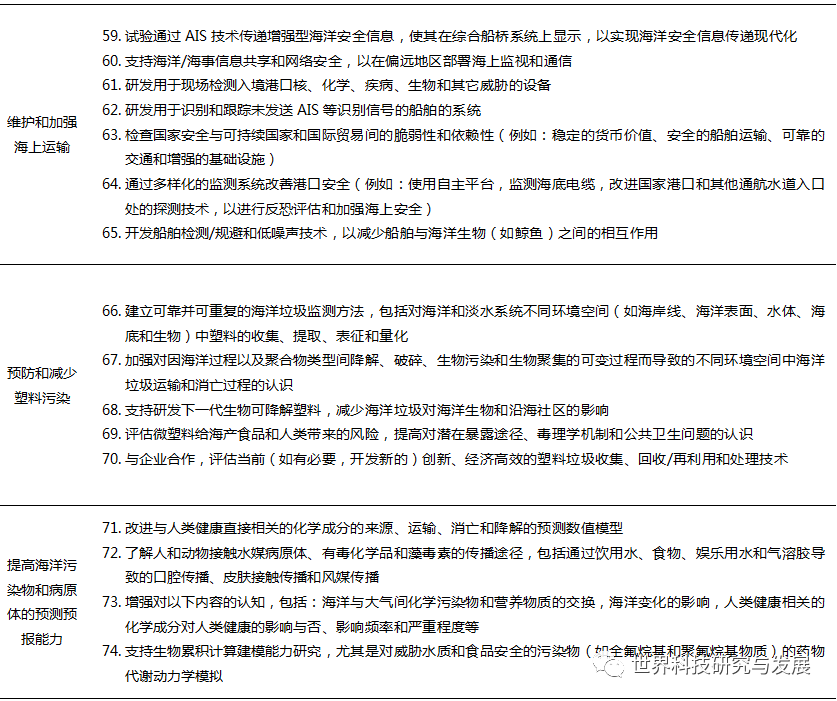 6 H% w4 T! T6 G8 ^- D4 ]/ n 海上安全对于美国保卫国土安全和保持军事优势是至关重要的,海上安全确保了国家经济繁荣和美国的全球领导地位。人工智能和卫星遥感等新技术在全球的快速发展,给国防和国土安全增加了巨大的复杂性,为了在日益复杂的全球海上环境中保持美国的竞争优势,美国必须持续推进海洋科学技术进步,不仅要保障国家海上安全,还要确保海上优势。保障海上安全是最新“十年”计划中新增的另一个海洋科技发展目标,涉及提高海上情景感知能力、了解不断变化的北极、维护和加强海上运输等三个方面,共提出了18个科学研究优先事项,详见表3。 + r' k3 x1 } a1 U. q+ D+ K# r8 e& a