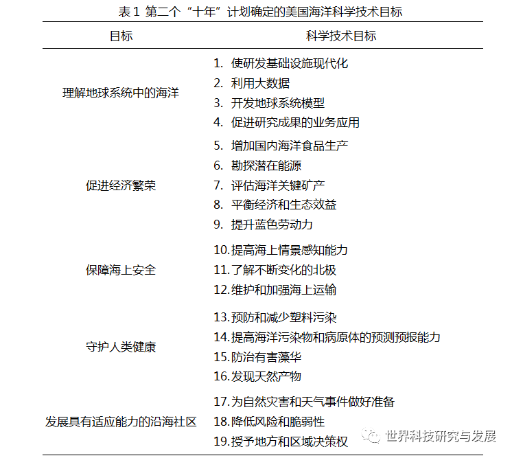 1 S4 {! ^5 d j8 C+ v2 q5 c 第二个“十年”计划确定了2018—2028年推进美国海洋科学技术和国家发展的五个目标:1)理解地球系统中的海洋;2)促进经济繁荣;3)保障海上安全;4)守护人类健康;5)发展具有适应能力的沿海社区。在这五大目标下设了19个具体的科学技术目标,见表1。