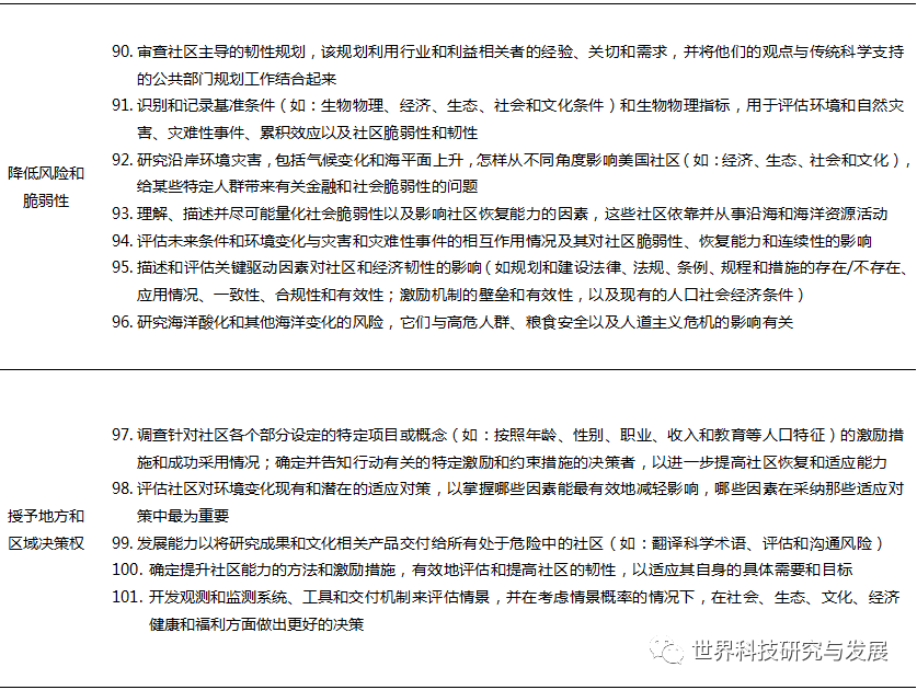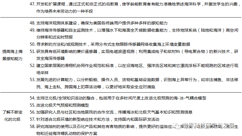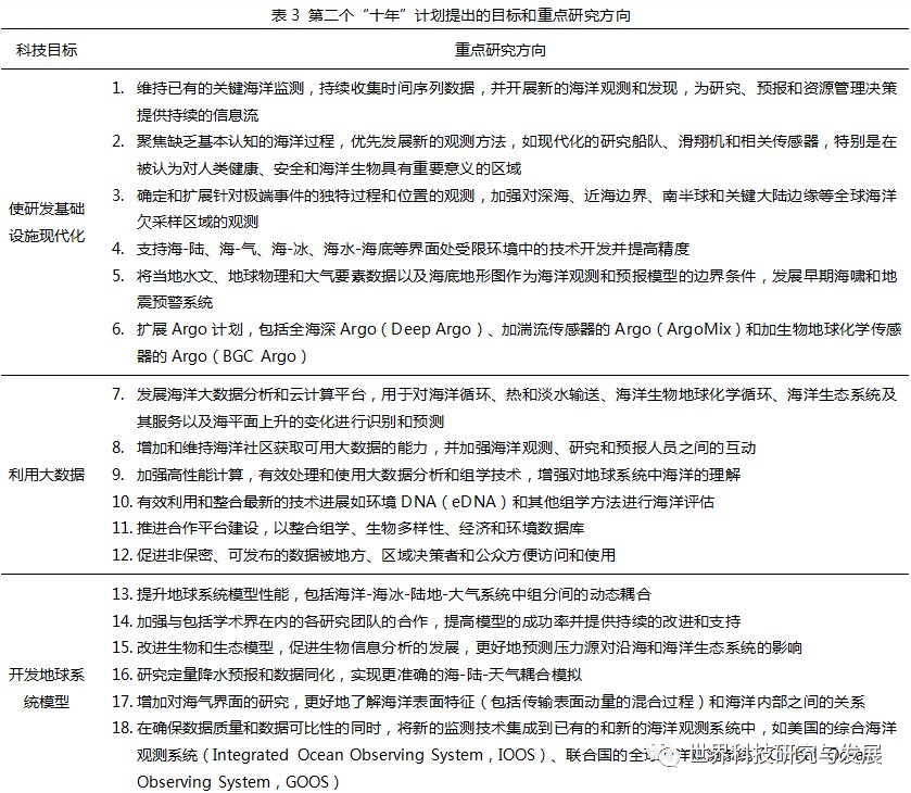 / I( a" y$ f* @# M) v 前后两个“十年”计划均明晰了实现美国海洋科学技术发展目标的优先支持科技重点。第一个“十年”计划的优先支持领域围绕着海洋与人类社会相互作用、提高人类生活质量、保障国家生态安全等方面的六大社会主题展开,共提出了20项科学研究优先重点及所需发展的关键技术(表2)。第二个“十年”计划在五个发展目标的19个科学技术目标下,提出了101项科学研究优先事项(表3),作为2018—2028年推进美国海洋科学技术发展的重点研究方向。 % R$ x3 ]7 R- H