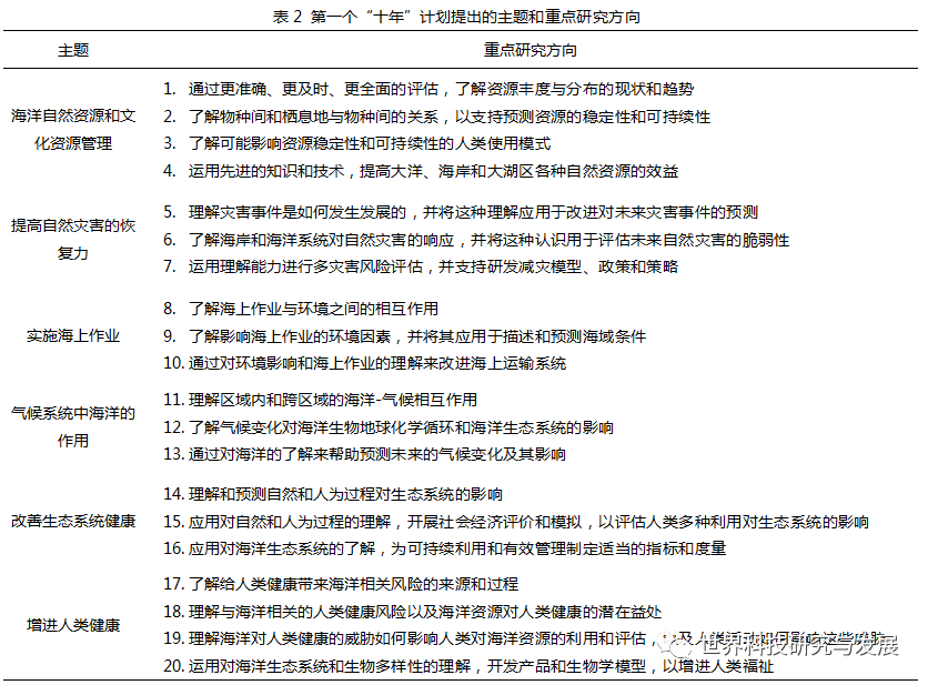 第一个“十年”计划将美国2007—2017年的海洋科学技术研究焦点集中在社会与海洋相互作用的关键领域,侧重于理解关键的海洋过程和相互作用,并将这种理解应用于管理海洋和科学利用海洋的三大核心板块:海洋预测预报、对基于生态系统的管理提供科学支持和海洋观测能力,这三个核心板块贯穿在整个美国海洋研究的六大研究主题中,分别是海洋自然资源和文化资源管理、提高自然灾害的恢复力、实施海上作业、气候系统中海洋的作用、改善生态系统健康和增进人类健康。
