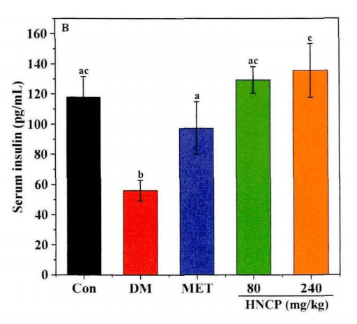 3 z) R' f2 s; p 对小鼠血清中胰岛素含量进行了测定。结果如图所示,经过二甲双胍和HNCP给药后,与模型组相比,给药各组小鼠血清胰岛素含量显著增加, 且HNCP给药组治疗效果明显,呈现出剂量依赖,胰岛素含量甚至略高于对照组。从以上结果可以得知,HNCP能够增加胰岛素的分泌。