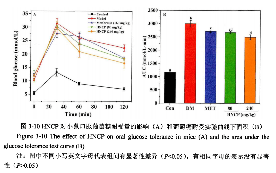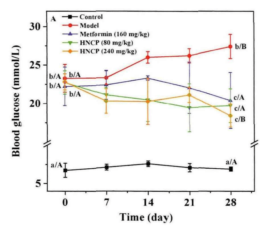 ! y3 y6 p: g2 l2 s 研究表明,灌胃葡萄糖后,各组小鼠血糖都有上升,但是对照组血糖没有其余各组上升明显;随后各组小鼠血糖均有下降趋势,HNCP低、高剂量给药组小鼠血糖明显低于模型组血糖水平。同时各给药组面积值显著低于模型组, 且HNCP给药效果好于二甲双胍,呈现剂量依赖。以上结果表明HNCP能改善糖尿病小鼠的糖耐受度,增加机体对葡萄糖的调节能力。 / a3 j0 T+ z" a- j# P2 x+ ?. p