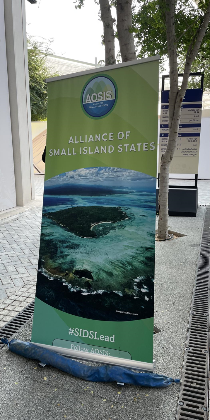 摄影:在国际上,关于关注小岛屿的呼声日涨。“小岛屿国家联盟”在第二十八届联合国气候变化大会(COP28)上的宣传标语。摄影:爱德华多·摩纳哥(EdoardoMonaco)博士。©绿会融媒·“海洋与湿地”(OceanWetlands)工作组 八次全体会议+五大互动对话