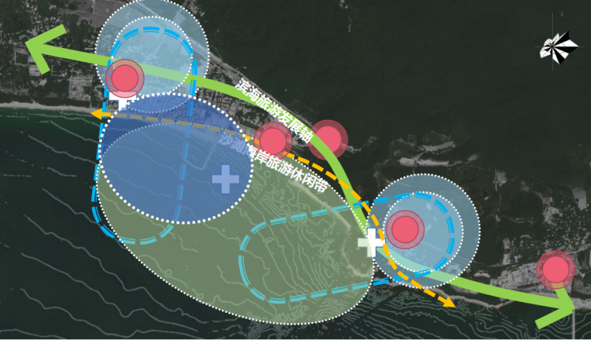 例如在三亚某项目旅游用海方案设计实践中,在进行项目的整体开发设计时,采用了“一轴一带、多片联动、多点协同”的整体联动结构方式。通过“一轴一带”带动陆域与海上各功能板块统筹发展,使各个功能区之间通过滨海岸线和海上游线进行联动;海陆之间的节点增强了交通联系,使功能区之间协同发展。