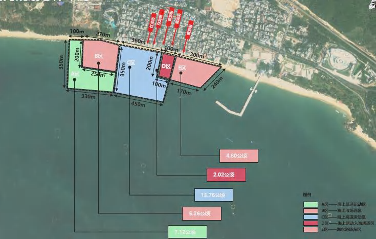 如在海上低速运动区,我们是这么设计布置的:海域总面积约7.12公顷,相关岸线约100米,整体呈“L”型布局,向海纵深约350米,海域水深为0~6米,海域开阔,风力相对充足,风向稳定,是最适合开展帆板、小帆船、双体帆船等其他水上游乐项目和产品的项目区域,也可以作为海上帆板、小帆船、双体帆船等体育运动的训练、比赛基地;岸滩适合开展沙滩休闲活动,近岸海上游乐运动体验与观赏等,近岸海域为初学者和一般体验者活动利用,远岸深水海域波浪较大,为熟练者、资深玩家和专业选手活动利用。 6 {" s& l: ^. \7 c t/ e: c4 B