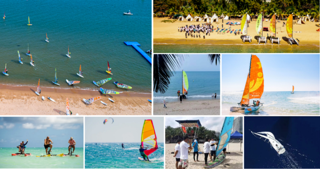 片区主打产品为帆板和帆船,特色基调为时尚、浪漫,一只只彩色风帆,似艳丽的蝴蝶飞舞穿梭在浪尖上,与碧蓝的大海互相辉映,为美丽的天涯小镇增添了一抹浪漫的气息。