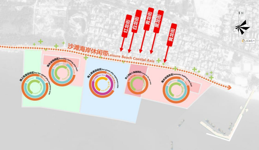 在进行项目用海布局设计时,采用了“一带、多区、多点”的用海布局。其中,“一带”指沙滩海岸休闲带;“多区”指海上各个功能区;“多点”主要指规划范围内重要功能节点,如配套设施、信息设施、休憩设施、卫生设施相对集中的经营服务场所和交通集散等重要功能节点。