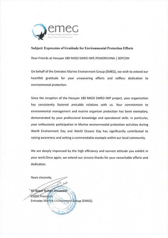 当地时间7月13日,中国电建阿联酋哈斯彦海水淡化项目部收到了阿联酋海洋环境环保机构发来的感谢信,对项目团队在施工期间对杰贝阿里地区的海洋生态环境保护方面作出的贡献和努力表示由衷感谢。此前,阿联酋主流英文媒体Gulf News刊登了中国电建在阿联酋开展海洋生态系统保护公益活动的报道,报道体现了外媒对中国电建始终坚持可持续发展和绿色低碳环保理念的肯定,称赞了中国电建为保护海洋和气候所作贡献,提升了中国电建在中东海湾国家的知名度。 ; w8 ~; S6 [3 q