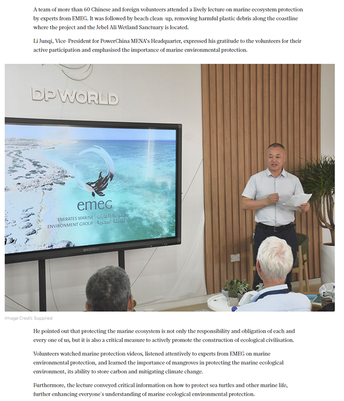 报道详细介绍了公益活动的开展情况。本次活动由中外各方60余名志愿者所组成的团队参加,邀请了阿联酋海洋环境环保机构环境组织专家作海洋生态系统保护讲座,并在中国电建哈斯彦项目所在地附近海岸线及杰贝阿里湿地保护区清理了海滩有害垃圾。报道指出,中国电建作为全球清洁低碳能源建设领域的领先企业,始终坚持可持续、绿色低碳发展理念,主动承担环境保护责任,致力于做好环境管理工作。 - V+ N. s# h* T5 B# Q6 ~. g