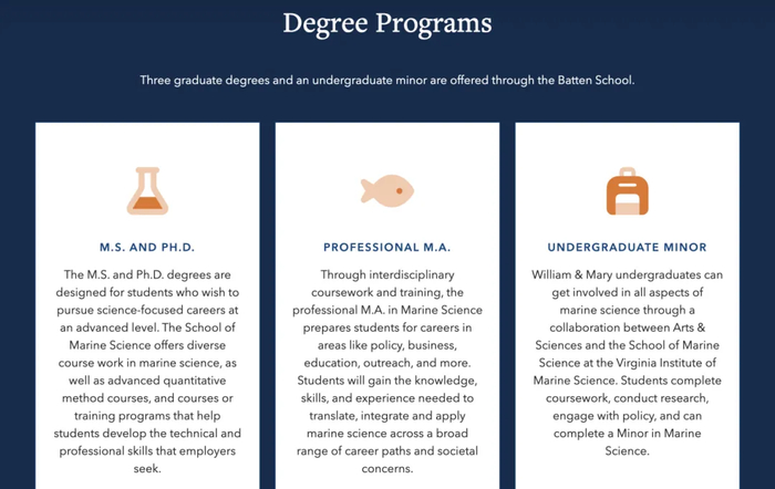 L8 ?! k2 n5 \/ S+ h+ ?- z$ D 目前,巴顿学院提供三个研究生和一个本科辅修项目,而作为的一部分,今年4月份威廉玛丽学院就提出,希望可以在2025年秋季开设弗吉尼亚州的第一个海洋科学本科项目。