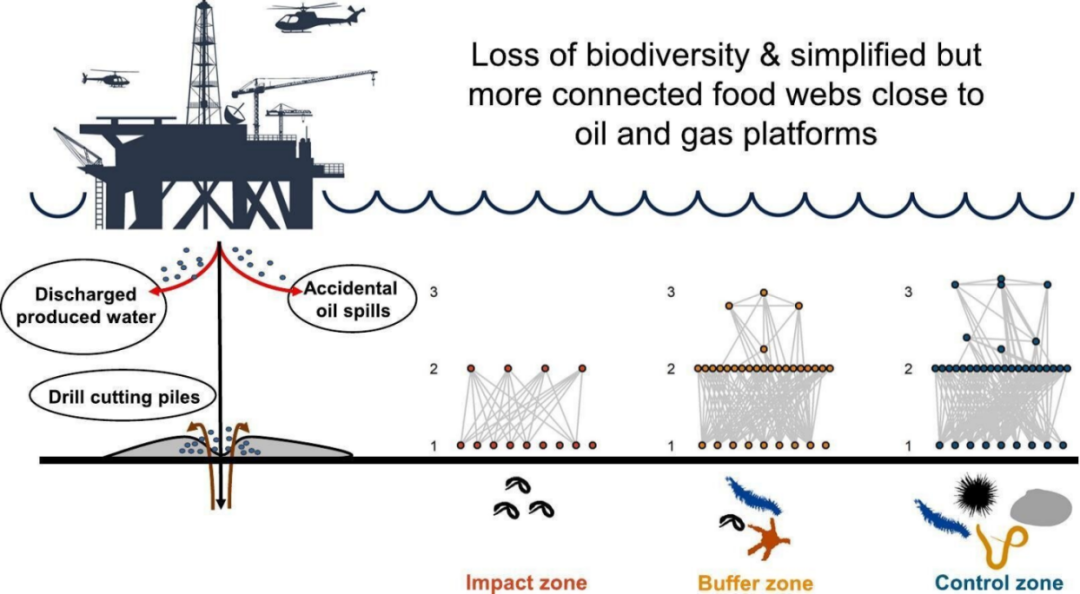 具体来说,研究发现,在距平台500米内,污染物如碳氢化合物的浓度高出10,613%,而重金属如铅、铜和镍的浓度也高出了455%。这些污染物已经在平台周围积累了几十年,直接影响了海洋无脊椎动物,这些动物在水下生态系统中扮演着重要角色,是较大鱼类等动物的食物来源。