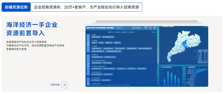 面对复杂多变的海洋资源开发环境和日新月异的海洋科技进展,各区域在规划海洋产业发展时,亟需专业智库的智力支持和科学指导。作为更懂中国产业的科技型决策智库——前瞻产业研究院,不仅提供产业规划、招商引资、园区建设、和项目运营等综合服务,还提供海洋经济产业数据大屏监测、产业链图谱编制、专项政策编制及培训指导全过程解决方案。 4 b; W7 \/ k/ r