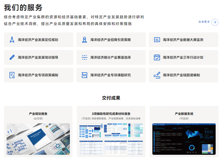 4 i3 \5 {, n9 @% \2 I 前瞻产业研究院在海洋经济产业规划的全过程中扮演重要的智库决策角色,前瞻先行成立了“海洋经济产业规划所”,希冀发挥“产业研究+大数据+技术洞察+招商资源前置”的独家特色产业规划服务,为各地政府提供既科学、又前瞻、更落地的产业规划整体咨询方案。 , T/ Q' d; }7 H5 f* ^4 {