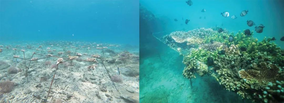生态苗圃区域珊瑚修复中(左)、修复后(右)。海南省自然资源和规划厅供图
