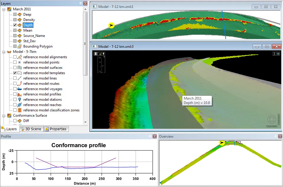 + J3 f) @1 O5 c ● 使用功能强大的3D可视化引擎识别危险沉积区域,然后发布这些浅滩区域的报告。  $ \6 u5 Q) S, F f8 o7 G. a t. {