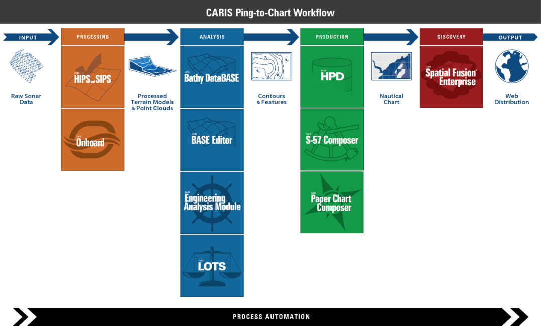 CARIS是目前全球唯一为水文测绘工作提供从采集到成图“Ping to Chart”完整解决方案的制造商。以“Ping to Chart”完整的解决方案为基础,CARIS可以针对不同的客户需求,提供全面的产品组合,下图为CARIS “Ping to Chart”产品线流程图。