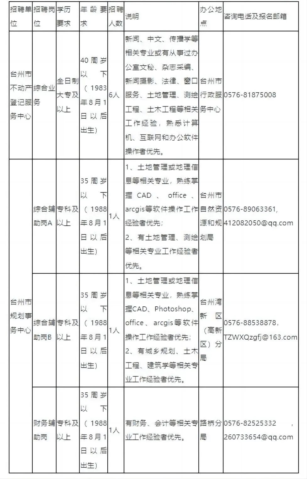 9 x! t+ u( n+ }; E& K: ` 因工作发展需要,经研究,台州市自然资源和规划局下属事业单位台州市不动产登记服务中心、台州市规划事务中心决定在全市范围内公开招聘编制外劳动合同用工人员。