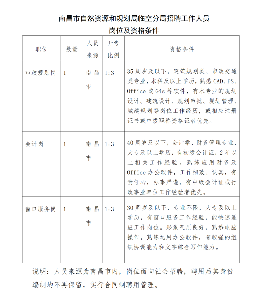 9 o3 ~! e- u! w) p3 b( T4 j 南昌市自然资源和规划局临空分局面向社会公开招聘合同制工作人员3名,详情如下。 : G D" y) L4 P7 n
