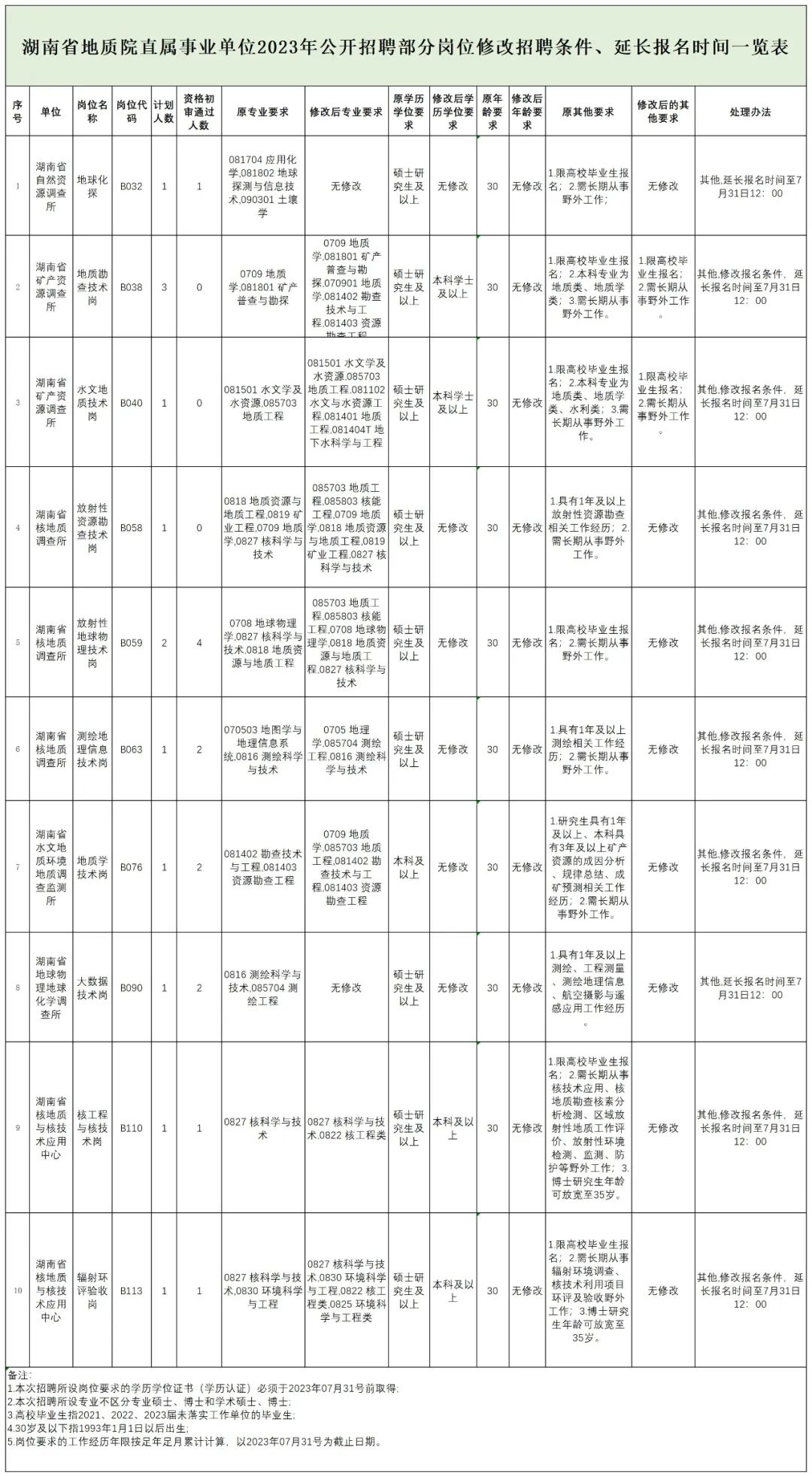 《湖南省地质院直属事业单位2023年公开招聘公告》于2023年7月11日在湖南省人力资源社会保障厅网站、湖南省地质院网站面向社会公开发布,按照公告要求,于7月21日-7月26日组织了公开报名和资格初审。因部分岗位无人报名或报名人数未达到开考比例,经省地质院党委集体研究,报省人力资源和社会保障厅同意,对未达到开考比例的岗位作如下处理。