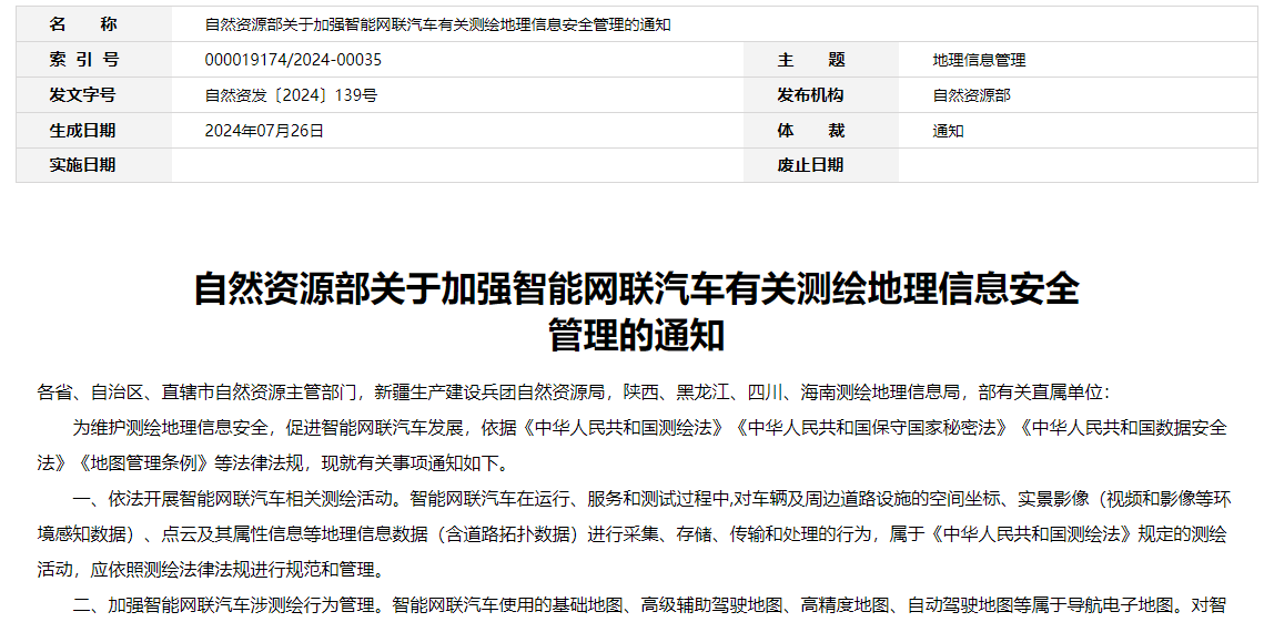 通知提出,对智能网联汽车回传的地理信息数据进行收集、存储、传输、处理以及地图制作等活动应由具有导航电子地图制作等测绘资质的单位承担;各地要从严审核把关导航电子地图,强化对导航电子地图制作测绘资质单位和车企的指导监督,确保地图通过审核后才能提供使用,地图新增地理信息内容必须进行安全审校,并及时备案。