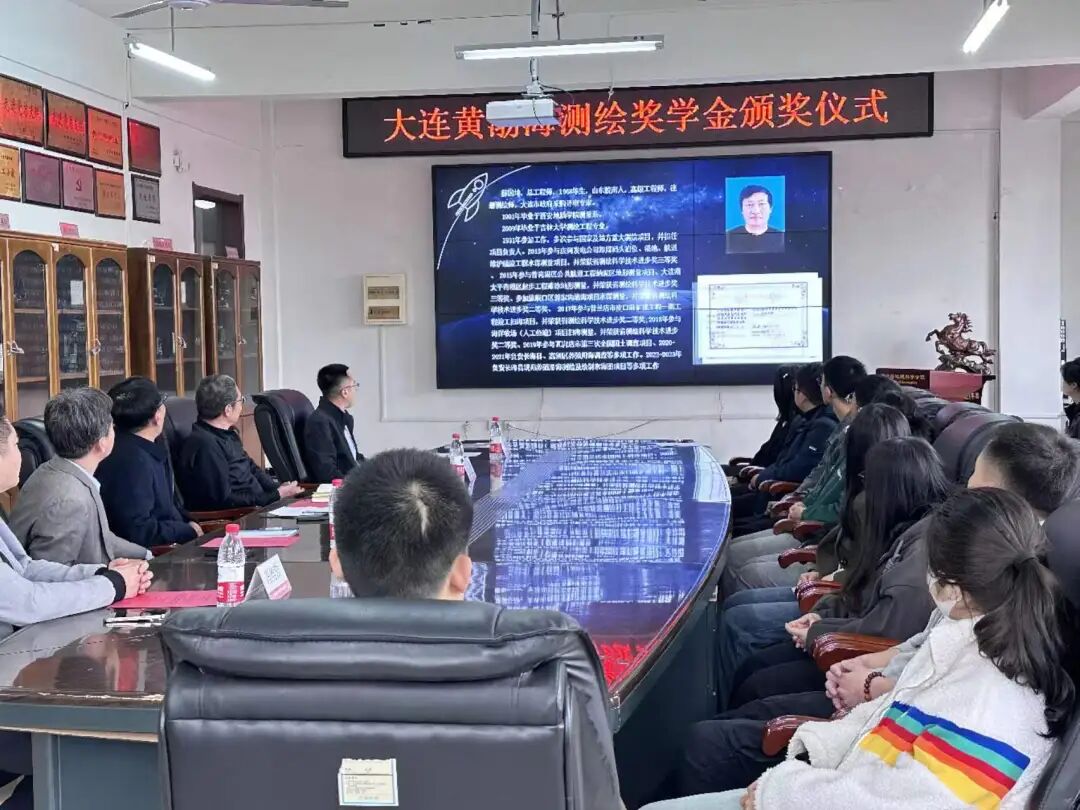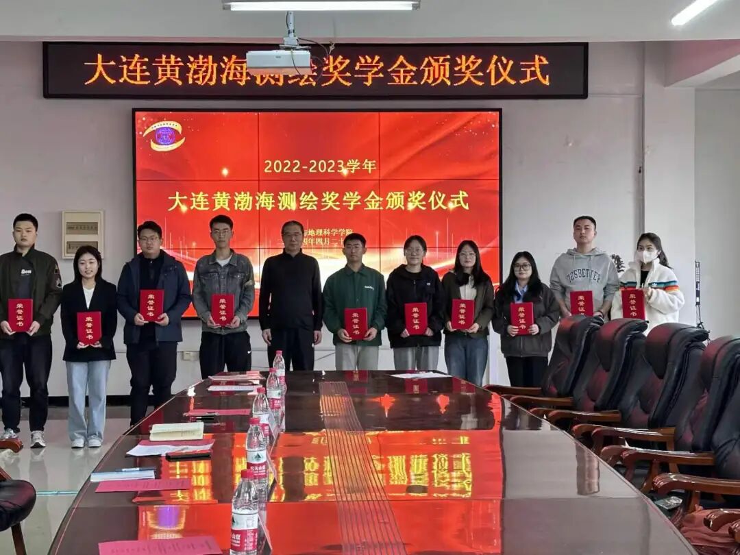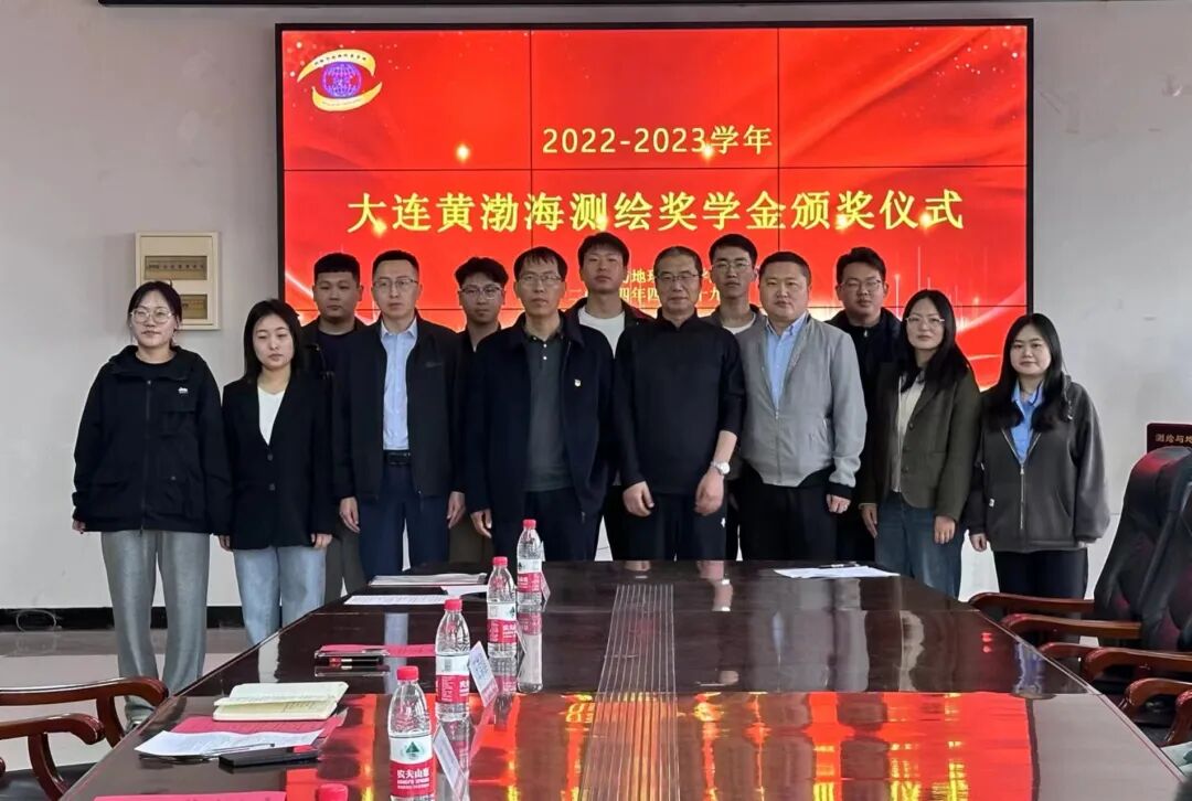 # K' J! W( J) I G 4月29日上午,测绘与地理科学学院在惠和楼322举行2022-2023学年大连黄渤海测绘奖学金颁奖仪式。大连黄渤海海洋测绘数据信息有限公司董事长蓝海、学院党委书记王崇倡、党委副书记范强、研究生工作部主任冯奥哲以及全体获奖学生参加了本次表彰仪式,仪式由学工部主任隋庆伟主持。