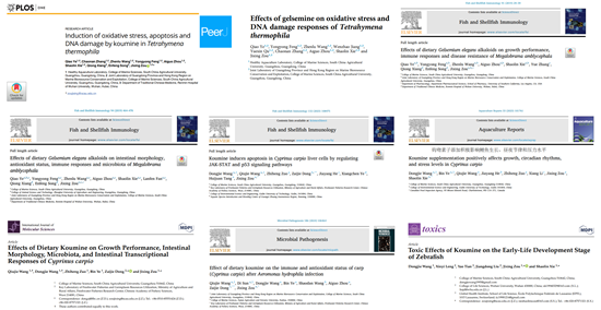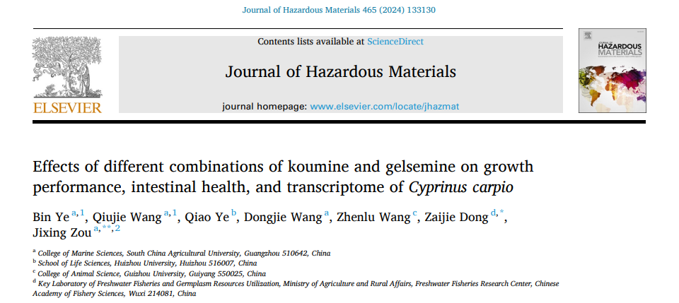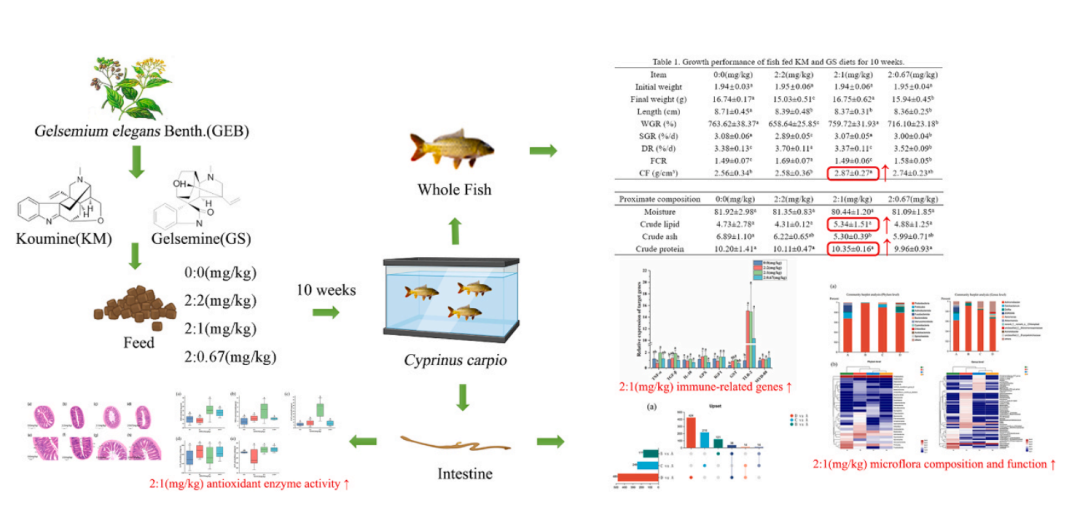 近日,华南农业大学海洋学院水产养殖系淡水鱼育种与健康养殖研究室邹记兴教授团队在Journal of Hazardous Materials(影响因子13.6,中科院一区Top)杂志发表“Effects of different combinations of koumine and gelsemine on growth performance,intestinal health,and transcriptome of Cyprinus carpio”的研究论文,2021级硕士生叶彬为论文第一作者,邹记兴教授、中国水产科学研究院淡水渔业研究中心董在杰研究员为共同通讯作者。该文研究了以不同配伍钩吻素子(koumine,KM)与钩吻素甲(gelsemine,GS)作为饲料添加剂对福瑞鲤的生长性能、肠道健康以及转录机制等方面的影响,为KM和GS作为饲料添加剂在水产养殖促长防病中的应用提供了有价值的新见解。 邹记兴教授团队自2019年就开始研究中国传统草药钩吻(Gelsemium elegans Benth.)促生长及替代抗生素在鱼类健康养殖中的可行性问题,钩吻素子与钩吻素甲则是钩吻中有生物活性功能的两种主要单体。尽管钩吻及其单体衍生物已经在畜牧业生产中进行了试验并表现出多种益处,但它们在水产养殖方面的研究和应用还是空白。2019年,该团队博士生叶鞘以嗜热四膜虫为模型,首次研究了钩吻素子和钩吻素甲对单细胞真核微生物的毒性作用。之后,又以斑马鱼为研究对象进一步探讨了钩吻的作用机理,研究了钩吻总碱作为饲料添加剂在团头鲂养殖中的应用。2020级硕士研究生王秋杰、2021级博士研究生王冬杰与2022级博士生研究生孙迪等发现钩吻素子不仅具有抗焦虑和抗炎等功效,还对家畜的生长具有促进作用,为此选择钩吻素子单体从福瑞鲤 “肠道-肝胰脏-大脑”生理轴角度研究了钩吻素子对福瑞鲤健康养殖的整体影响,表明添加适量的钩吻素子在福瑞鲤的养殖应用及免疫能力调节中具有积极的影响,而且在鱼种早期阶段能促进生长和部分替代抗生素的作用,具有广阔的应用前景。 在前期研究基础上,2021级硕士研究生叶彬等将钩吻素子与钩吻素甲以不同配伍的方式用作饲料添加剂,探究其对福瑞鲤的影响。研究结果显示,2:1(mg/kg)配伍的KM与GS能通过增加肠道绒毛长度和肌层厚度来改善鲤鱼的肠道结构,并促进蛋白质和脂质在鱼体内的沉积。KM和GS的添加能够增加鲤鱼体内各种脂肪酸的含量,改善其营养成分。不仅如此,KM和GS还能够改善肠道微生物菌群的组成和功能,提高肠道抗氧化酶的活性,并上调免疫相关基因的表达,从而维护肠道和鱼类的健康。 上述论文是邹记兴教授团队在淡水鱼“无抗健康养殖”研究等方面取得的最新进展,邹记兴教授均为通讯作者之一,是国家现代农业产业技术体系(CARS-45)资助的部分成果。除上述学生外,参加该项目研究的老师和学生,还包括周爱国、谢少林、唐汇娟、王桢璐、冯永永、张超楠、王少聃、胡波、郑雨顺、覃瑶等。此外,植物保护学院徐汉虹教授协助指导了试验和提供了钩吻栽种场地,中国水产科学研究院淡水渔业研究中心董在杰研究员提供了部分经费支持。论文链接:https://www.sciencedirect.com/science/article/pii/S0304389423024147https://journals.plos.org/plosone/article?id=10.1371/journal.pone.0212231https://peerj.com/articles/6093/https://www.sciencedirect.com/science/article/pii/S1050464819305820?via%3Dihubhttps://www.sciencedirect.com/science/article/pii/S1050464819309325?via%3Dihubhttps://www.mdpi.com/1422-0067/23/19/11860https://www.sciencedirect.com/science/article/pii/S2352513423003009https://www.sciencedirect.com/science/article/pii/S1050464822008154?via%3Dihubhttps://www.sciencedirect.com/science/article/pii/S0882401023004977?via%3Dihubhttps://www.mdpi.com/2305-6304/11/10/853来源:华南农业大学海洋学院关注公众号,发现更多精彩内容!" E, \ K7 b2 q( K# a3 A