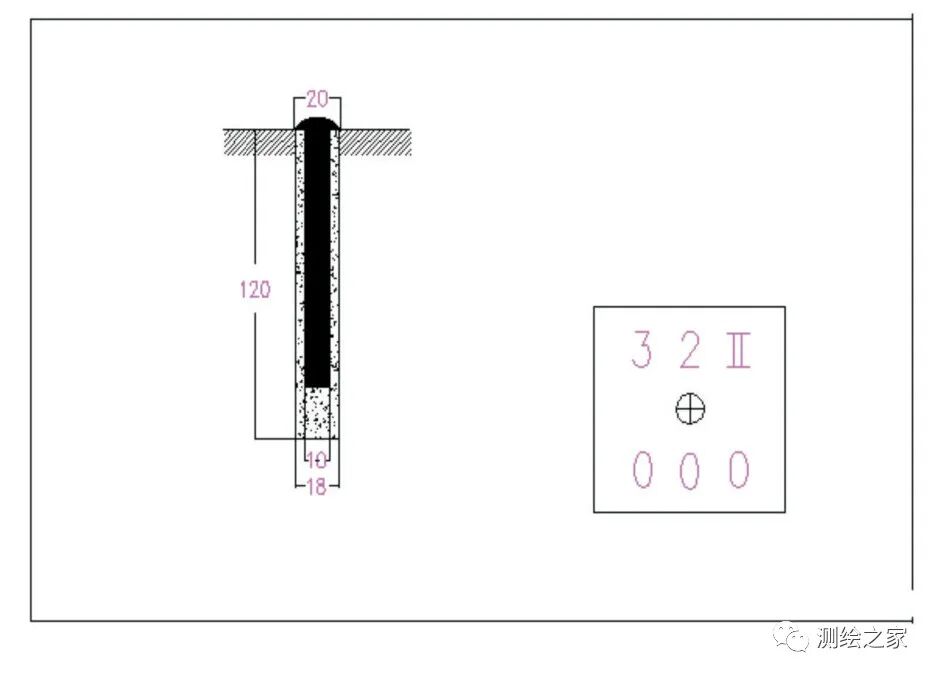 (4)测站应位于地质条件良好、点位稳定、易于保护的地方,并尽可能顾及交通等条件。 (5)充分利用符合要求的原控制点。3.2.2 埋石控制点的埋石采用现场浇注的方法进行,事先在选点位置用电钻孔,然后用混凝土将孔填充,最后将标志镶嵌在混凝土中,埋设后,用切割机进行切割,统一编号,编号为;32Ⅱ001,32Ⅱ002,......,32Ⅱ22。具体埋设要求和编号如图1所示。
