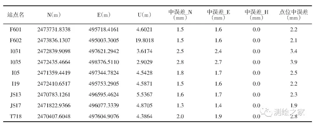 2 w5 b; B/ R4 Z 平面四参数: X平移(m):-1739.54353741482;Y平移(m):75610.6464624293;旋转:-000:14:27.92334;缩放:0.999952395270672;……。5.2.3 二维约束平差坐标(部分)表1 平差坐标表