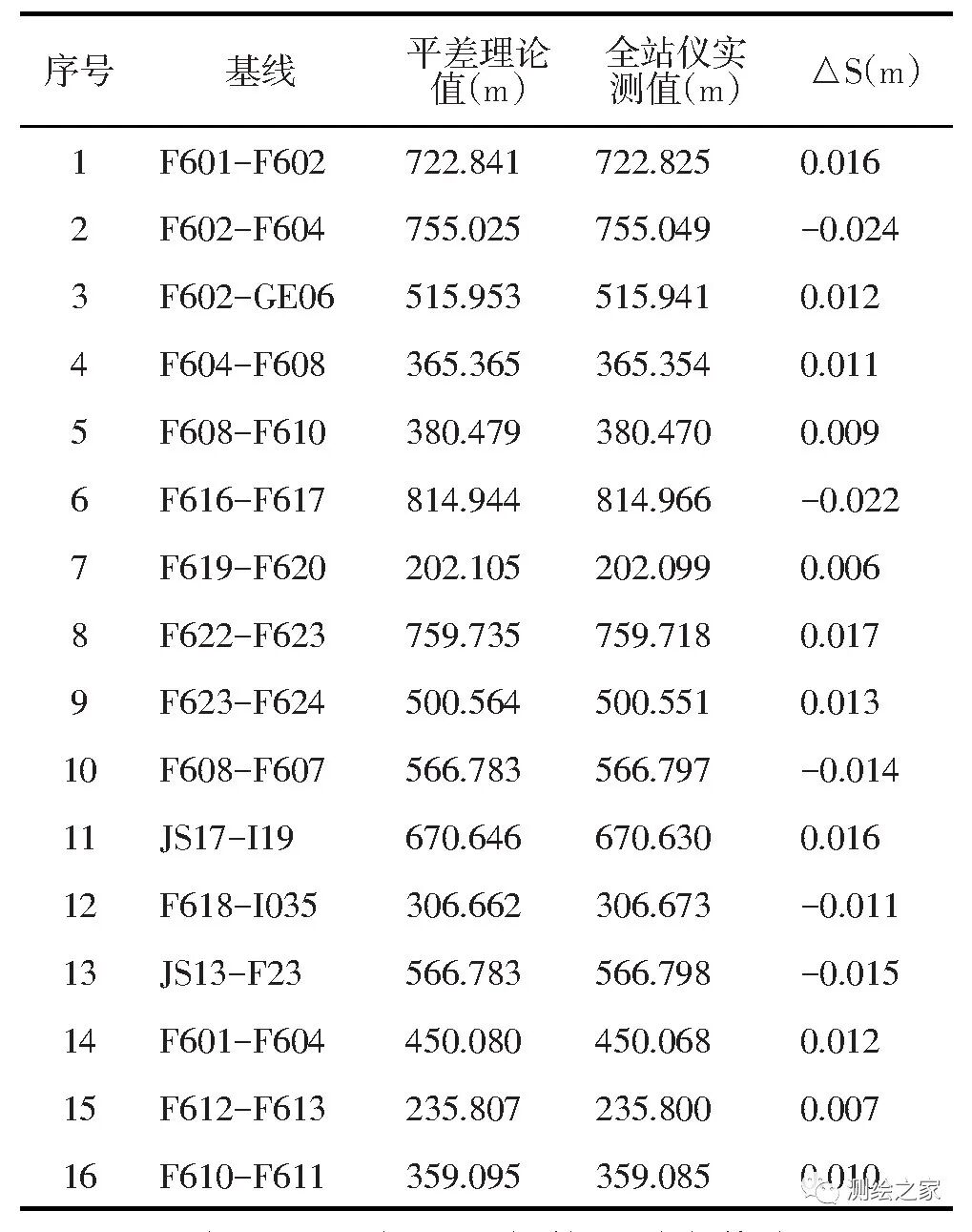 6 成果检核为了能够有效确保整个GPS控制网实测精度符合相关的精度值测定要求,GPS控制测量工作完成后,仍需对静态GPS测量成果进行相应的对比工作,采用高精度全站仪(2″以上)对部分相互通视站点进行边长检查,总共对16边进行检核,检核结果如表2。