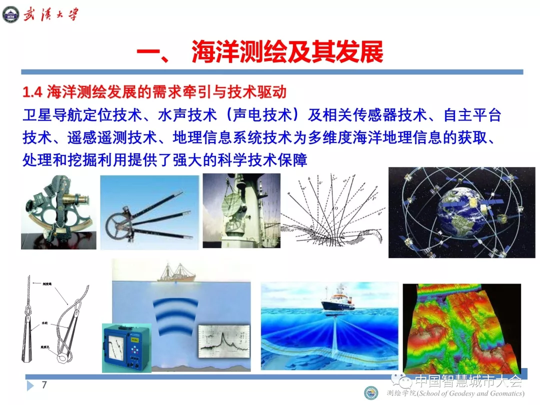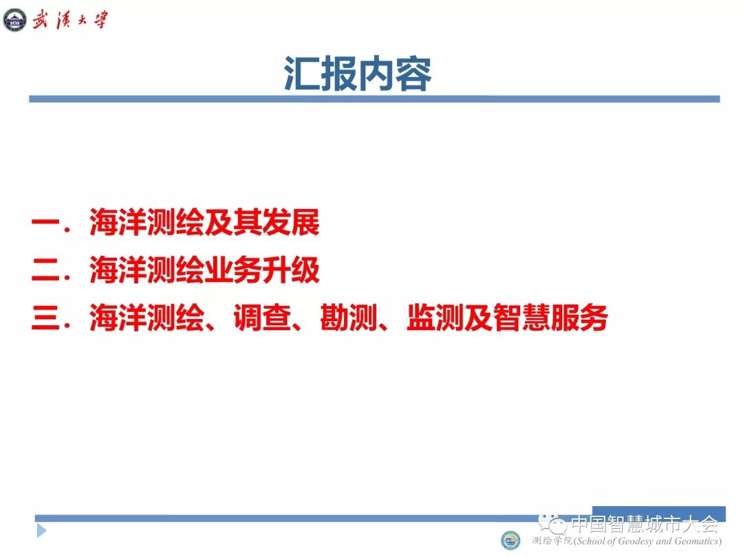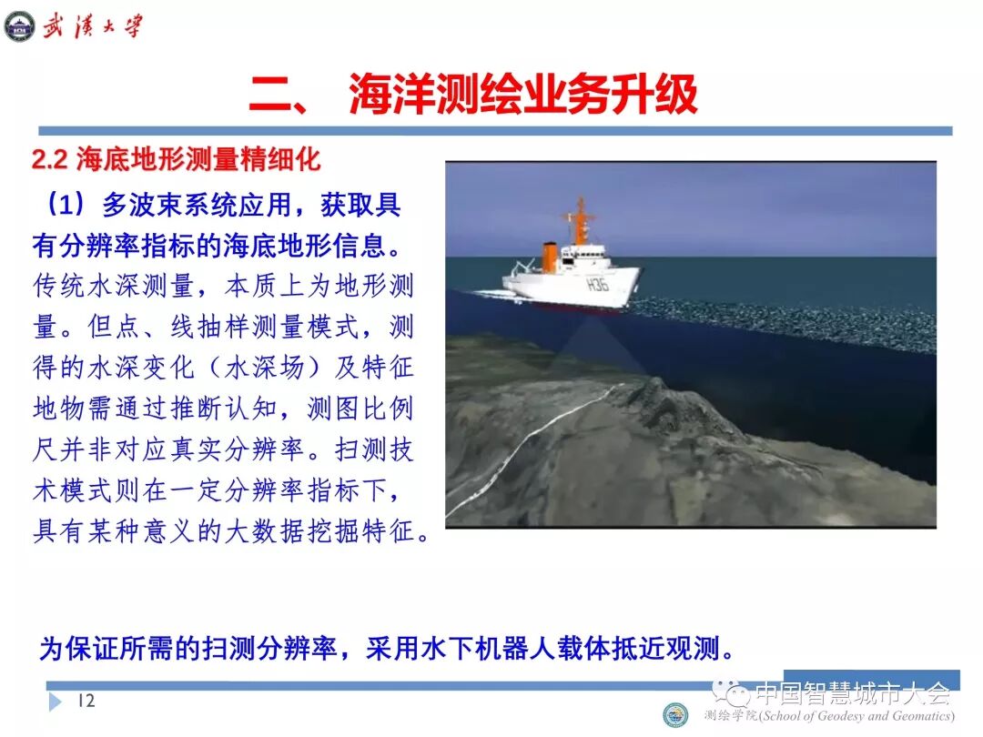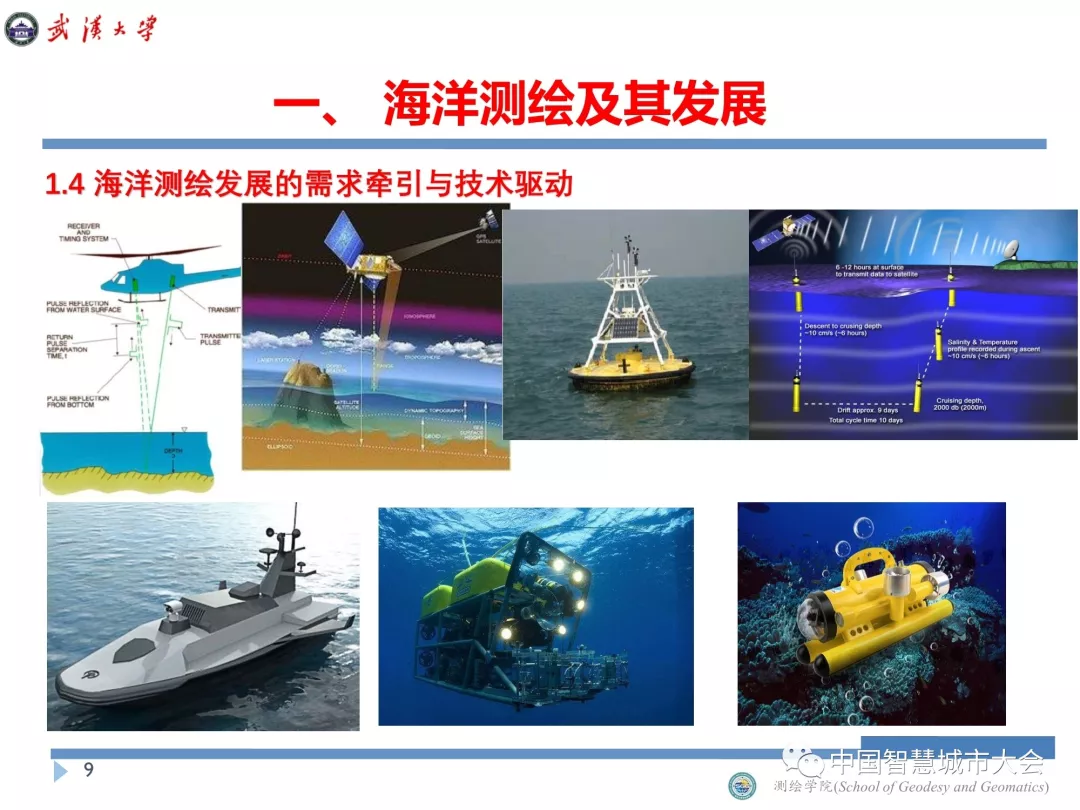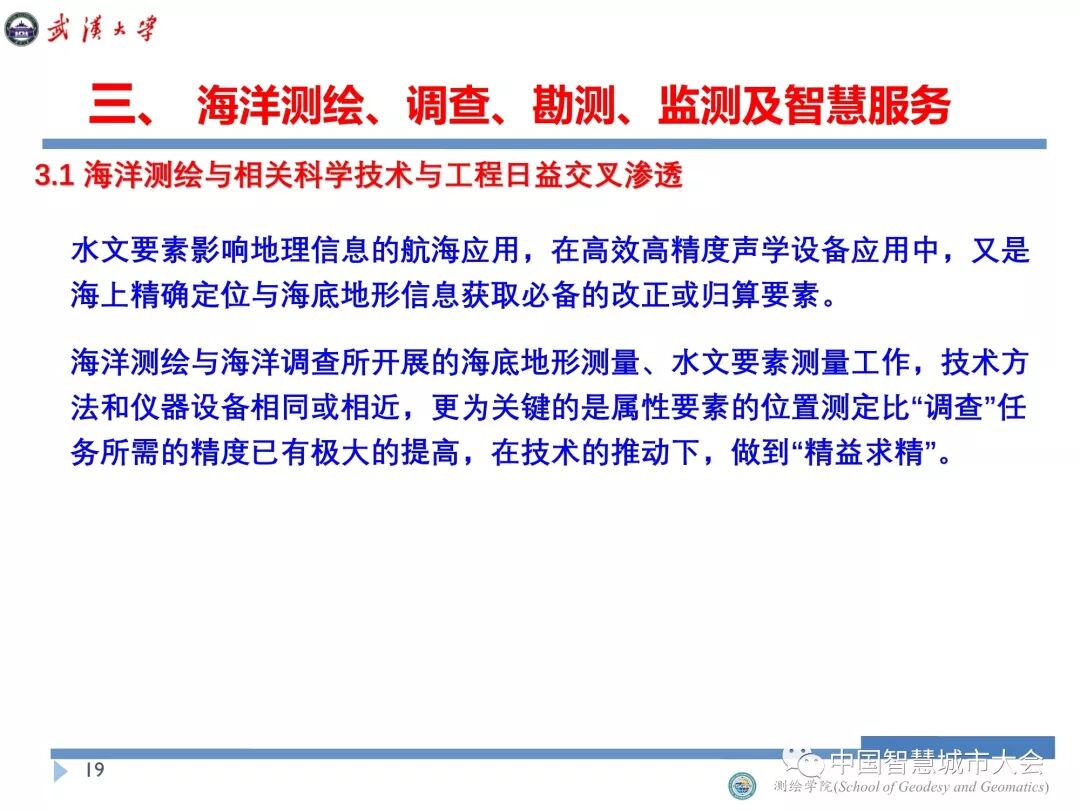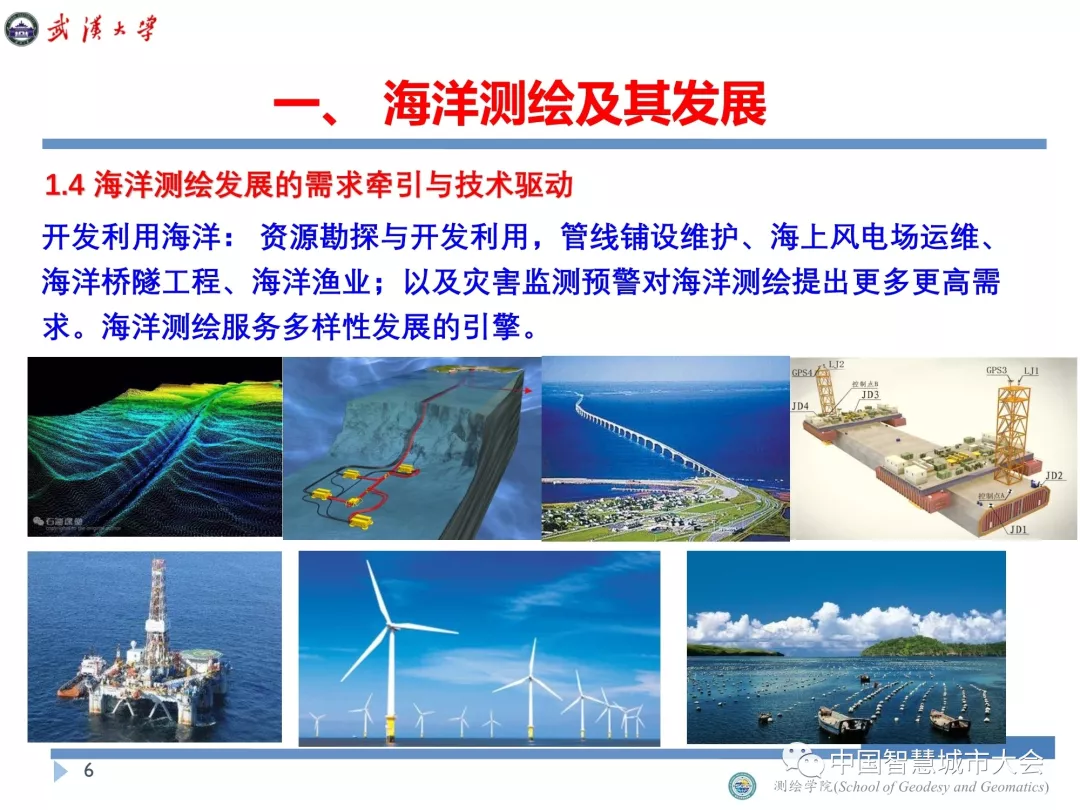 更多精彩,请点击上方蓝字关注我们!中国智慧城市大会智慧海洋分论坛演讲PPT集锦暴景阳 :教授 博士生导师现任武汉大学海洋研究院教授,曾任海军大连舰艇学院教授演讲题目:《海洋测绘及其智慧海洋建设服务》演讲人介绍:1987年7月毕业于海军大连舰艇学院海道测量专业,获学士学位;1993年7月毕业于海军大连舰艇学院海洋测量学科,获硕士学位;2002年12月,毕业于武汉大学大地测量与测量工程学科,获博士学位。从事海洋测绘教学与研究,特别是在海洋测绘垂直基准、海洋潮汐理论与测绘应用等。曾主持各类科研项目和国家专项建设任务30余项。发表学术论文170余篇,出版著作5部。参与《中国大百科全书》、《测绘词典》、《海洋测绘词典》等辞书涉及海洋测绘有关条目的撰写。国标《海道测量规范》主要修订人之一,能源行业标准《海上风电场工程测量规范》主审。获国家科技进步二等奖1项,军队科技进步奖8项,国家行业学会科技进步奖6项。获中国测绘学会海洋测绘专业委员会首届海洋测绘学科发展突出贡献奖、军队院校育才奖银奖、海军优秀党员等个人奖励或表彰。现任中国测绘学会大地测量与导航专业委员会委员、中国海洋学会海洋测绘专业委员会委员、中国海洋发展研究会海洋勘测与地理信息产业研究分会副理事长。                    fill=%23FFFFFF%3E%3Crect x=249 y=126 width=1 height=1%3E%3C/rect%3E%3C/g%3E%3C/g%3E%3C/svg%3E)  fill=%23FFFFFF%3E%3Crect x=249 y=126 width=1 height=1%3E%3C/rect%3E%3C/g%3E%3C/g%3E%3C/svg%3E)  fill=%23FFFFFF%3E%3Crect x=249 y=126 width=1 height=1%3E%3C/rect%3E%3C/g%3E%3C/g%3E%3C/svg%3E)  fill=%23FFFFFF%3E%3Crect x=249 y=126 width=1 height=1%3E%3C/rect%3E%3C/g%3E%3C/g%3E%3C/svg%3E)  fill=%23FFFFFF%3E%3Crect x=249 y=126 width=1 height=1%3E%3C/rect%3E%3C/g%3E%3C/g%3E%3C/svg%3E) % n3 ~" ^3 \8 \* o+ l, c