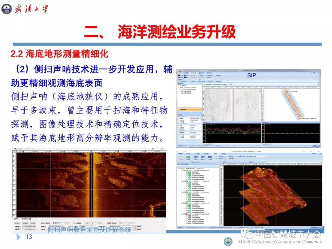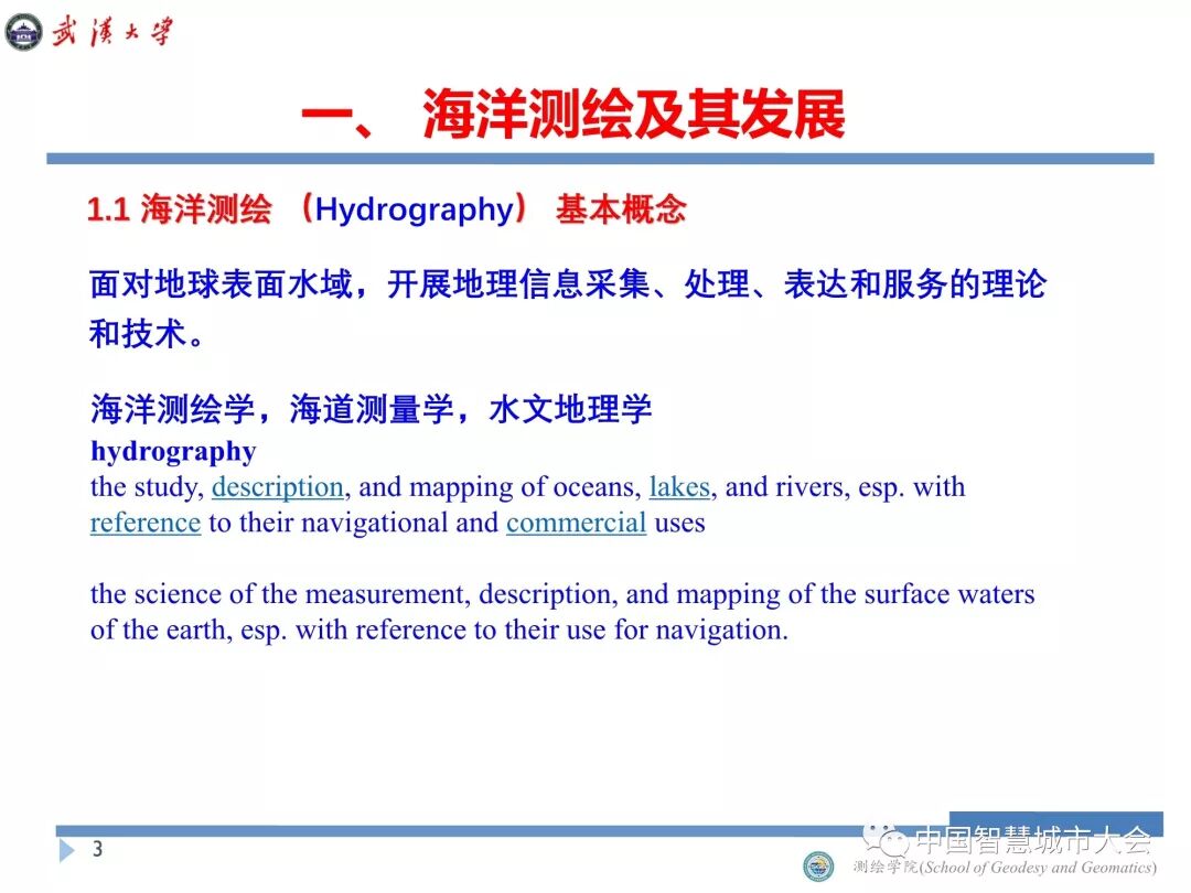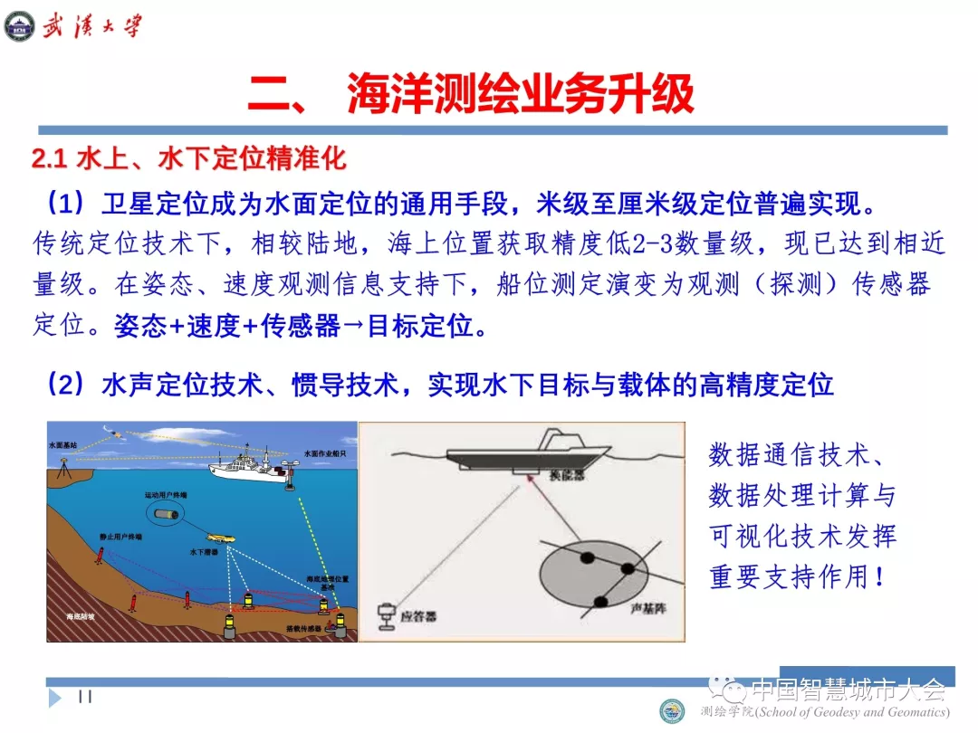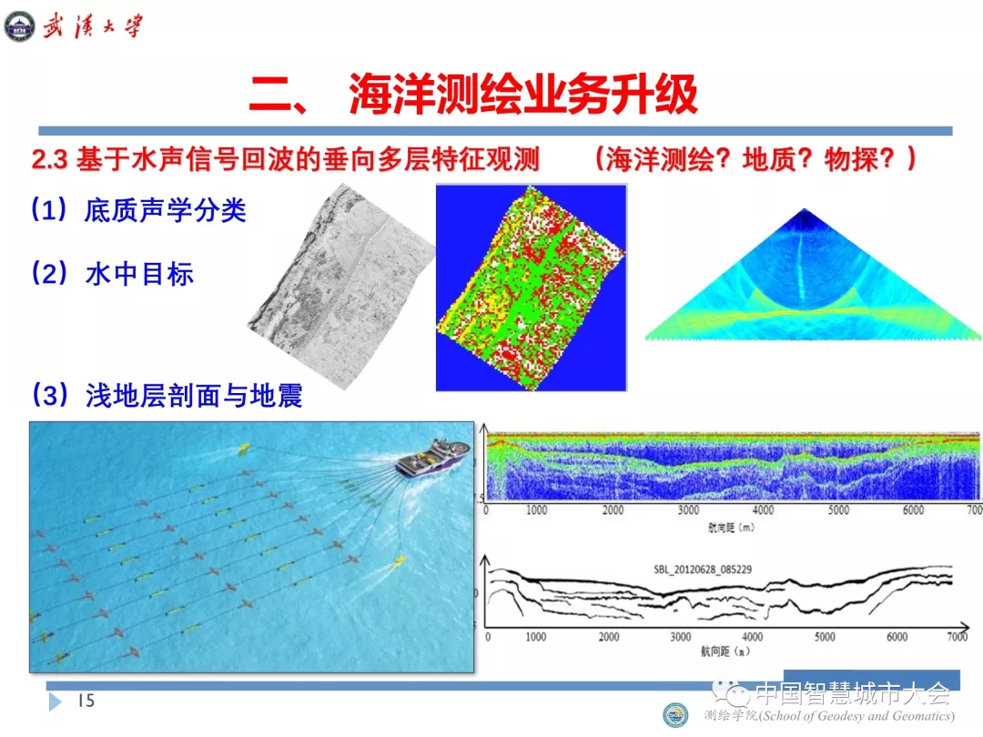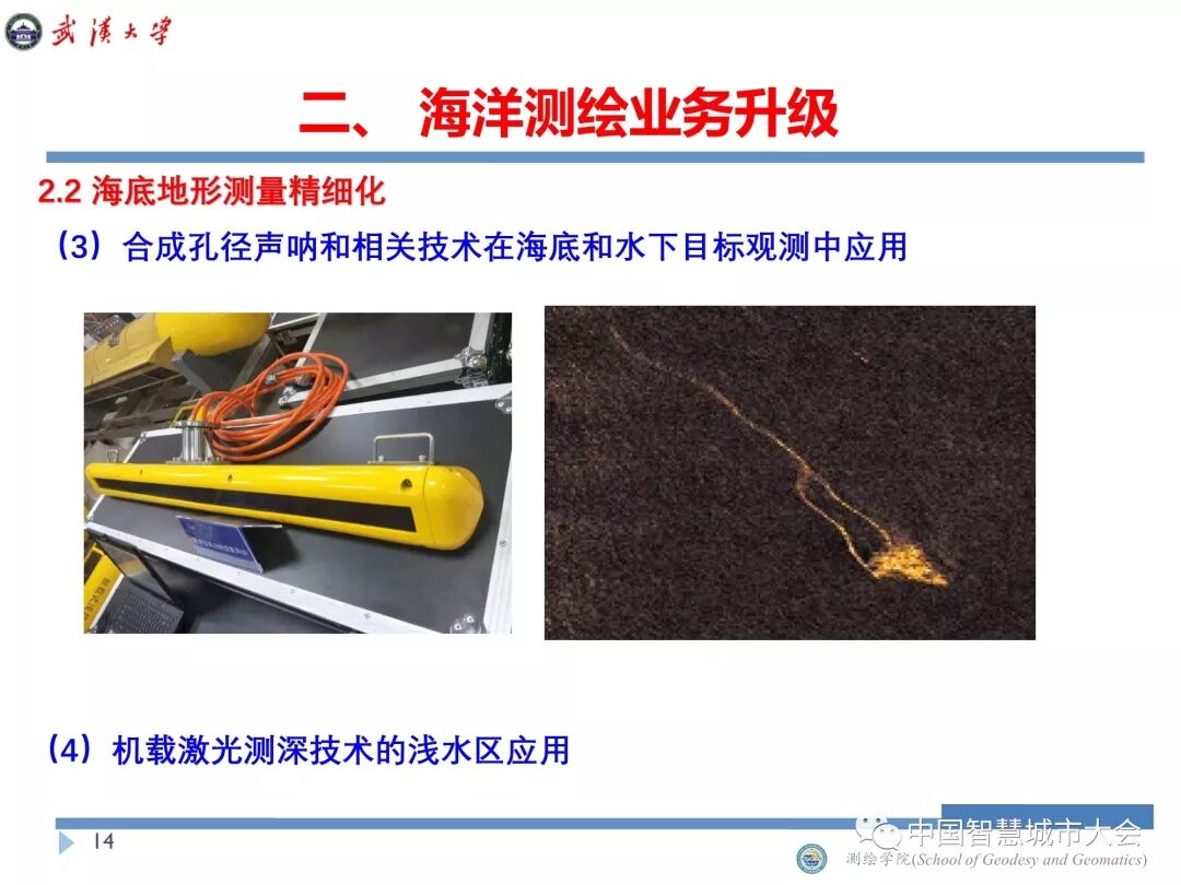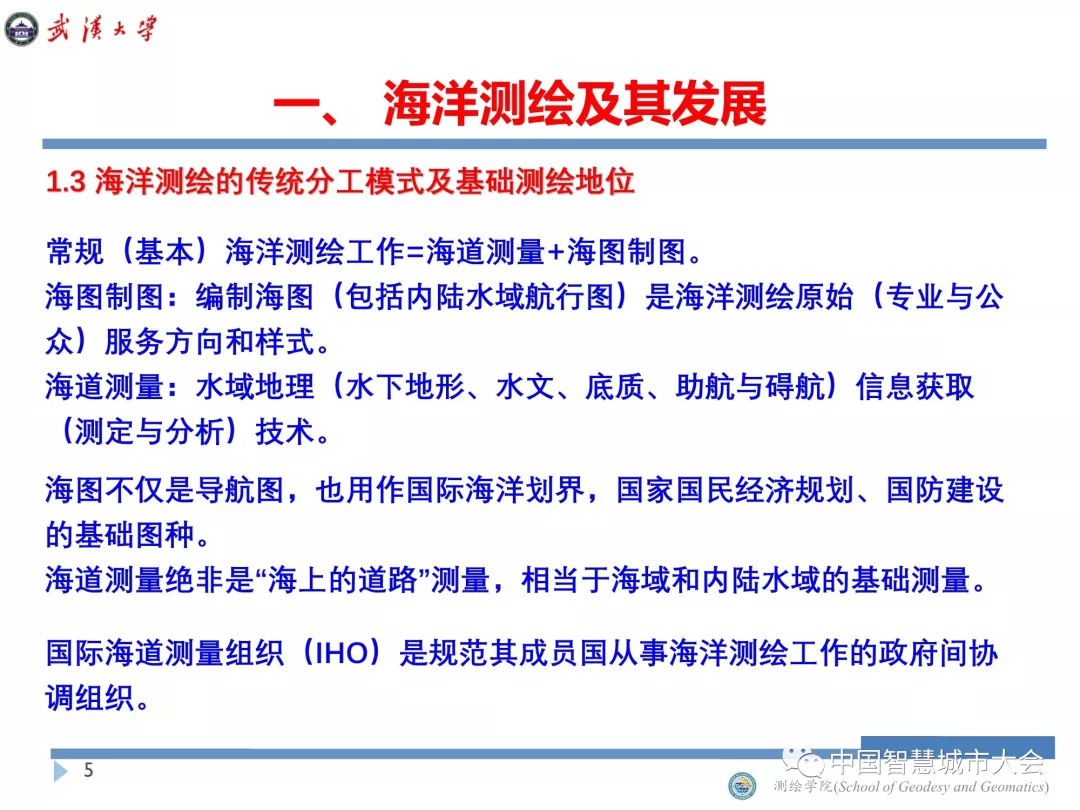 更多精彩,请点击上方蓝字关注我们!中国智慧城市大会智慧海洋分论坛演讲PPT集锦暴景阳 :教授 博士生导师现任武汉大学海洋研究院教授,曾任海军大连舰艇学院教授演讲题目:《海洋测绘及其智慧海洋建设服务》演讲人介绍:1987年7月毕业于海军大连舰艇学院海道测量专业,获学士学位;1993年7月毕业于海军大连舰艇学院海洋测量学科,获硕士学位;2002年12月,毕业于武汉大学大地测量与测量工程学科,获博士学位。从事海洋测绘教学与研究,特别是在海洋测绘垂直基准、海洋潮汐理论与测绘应用等。曾主持各类科研项目和国家专项建设任务30余项。发表学术论文170余篇,出版著作5部。参与《中国大百科全书》、《测绘词典》、《海洋测绘词典》等辞书涉及海洋测绘有关条目的撰写。国标《海道测量规范》主要修订人之一,能源行业标准《海上风电场工程测量规范》主审。获国家科技进步二等奖1项,军队科技进步奖8项,国家行业学会科技进步奖6项。获中国测绘学会海洋测绘专业委员会首届海洋测绘学科发展突出贡献奖、军队院校育才奖银奖、海军优秀党员等个人奖励或表彰。现任中国测绘学会大地测量与导航专业委员会委员、中国海洋学会海洋测绘专业委员会委员、中国海洋发展研究会海洋勘测与地理信息产业研究分会副理事长。                    fill=%23FFFFFF%3E%3Crect x=249 y=126 width=1 height=1%3E%3C/rect%3E%3C/g%3E%3C/g%3E%3C/svg%3E)  fill=%23FFFFFF%3E%3Crect x=249 y=126 width=1 height=1%3E%3C/rect%3E%3C/g%3E%3C/g%3E%3C/svg%3E)  fill=%23FFFFFF%3E%3Crect x=249 y=126 width=1 height=1%3E%3C/rect%3E%3C/g%3E%3C/g%3E%3C/svg%3E)  fill=%23FFFFFF%3E%3Crect x=249 y=126 width=1 height=1%3E%3C/rect%3E%3C/g%3E%3C/g%3E%3C/svg%3E)  fill=%23FFFFFF%3E%3Crect x=249 y=126 width=1 height=1%3E%3C/rect%3E%3C/g%3E%3C/g%3E%3C/svg%3E) % n3 ~" ^3 \8 \* o+ l, c