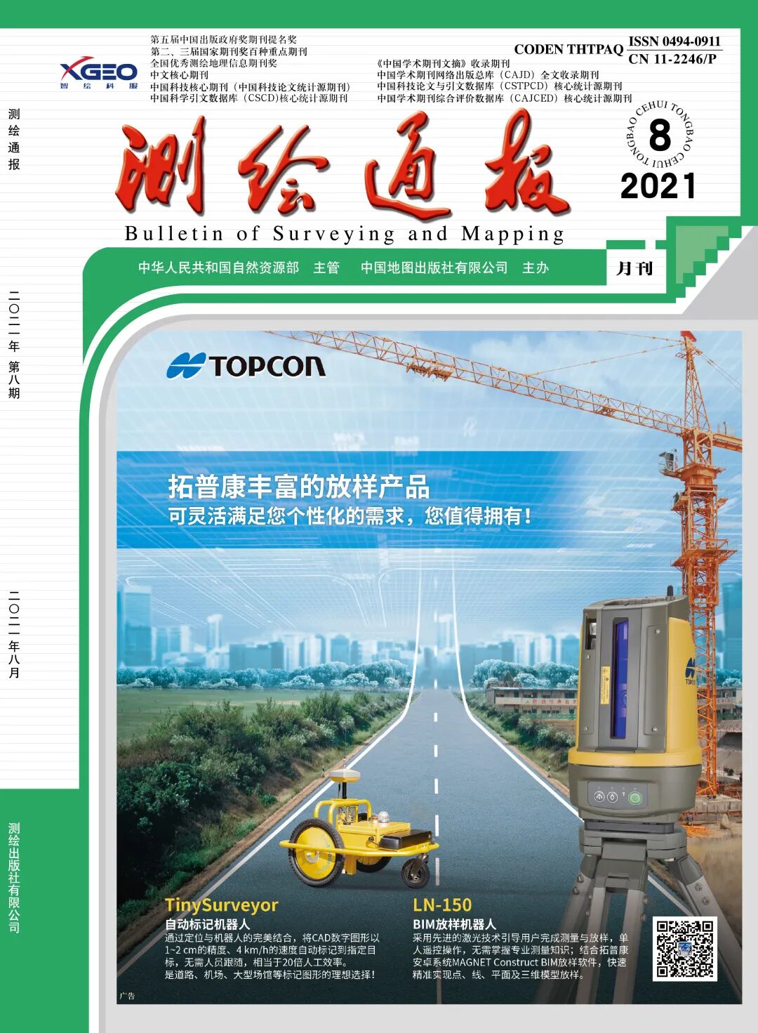 《测绘通报》创刊于1955年,是由中华人民共和国自然资源部主管,中国地图出版社(测绘出版社)主办的综合性、技术性中文核心期刊。 8 s7 S$ t4 {9 i7 v. f) b
