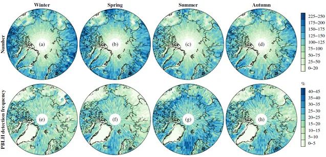 5 U; F) A2 m ^0 N( [! D2 Q 2006.12–2019.11期间各季节的到达北极地表500m以内的掩星观测数量的空间分布,以及对应的北极大气边界层高度的探测频率的空间分布
