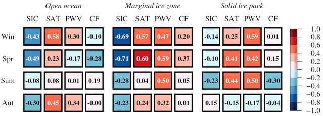 北冰洋开阔水域、冰边缘区和固体冰区的PBLH与SIC、SAT、PWV和CF异常变化之间的相关性。白色粗体数字表示通过了80%置信区间的显著性统计结果
