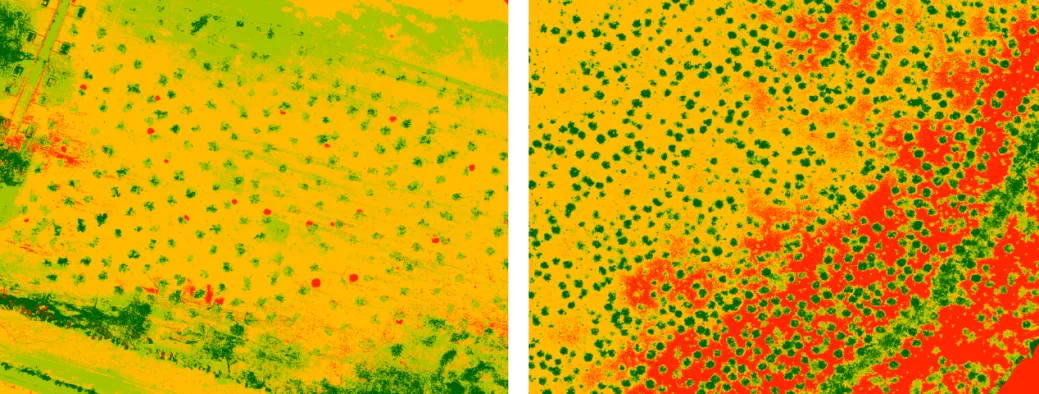 # D, l; Y( A) l1 m! c% R7 y 通过超高分辨率正射影像(地面分辨率<1 cm/pixel)可识别修复区域内植被的位置和物种,统计植株数量,计算植被密度、覆盖面积及郁闭度,评估植被健康状况。也可识别修复区域内存在的各类垃圾、违规建筑等人类活动痕迹,从而评估人类对生态修复区域的干扰强度。