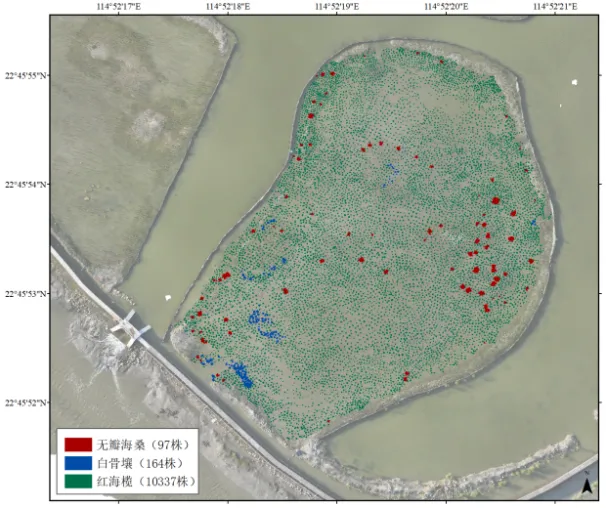 # g! E3 v$ p; o) |. ` 以惠州市惠东县考洲洋重点海湾整治项目中红树植株分类识别结果为例,通过对遥感影像的识别和提取,可得出该种植区域内红树植株总数为10598株,其中红海榄10337株(占比97.54%),白骨壤164株(占比1.55%),无瓣海桑97株(占比0.92%),植株总体密度为15423.24 ind/ha,树冠总面积529.87 m2,覆盖率为7.71%。 # c4 y/ b( O2 I( q& m2 C