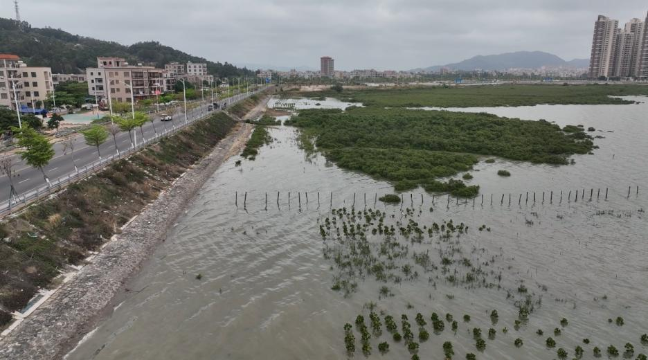 博贺湾重点海湾整治项目根据因地制宜的修复原则,在原生红树林基础上,采用红树林修复和海堤生态化相结合的方式,利用堤前红树林的消浪作用,有效降低了海浪对海堤上生态材料的侵蚀作用,达到“1+1>2”的生态修复效果。 . ^% d: ^5 `) G# _6 V